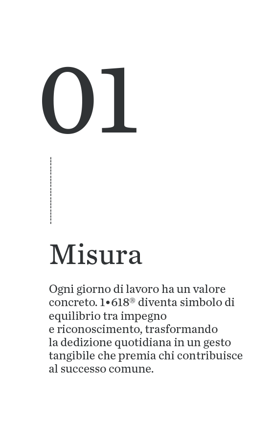 Ogni giorno di lavoro ha un valore concreto. 1•618® diventa simbolo di equilibrio tra impegno e riconoscimento, trasformando la dedizione quotidiana in un gesto tangibile che premia chi contribuisce al successo comune.