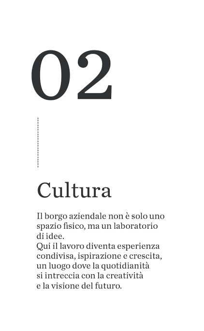 Il borgo aziendale non è solo uno spazio fisico, ma un laboratorio di idee. Qui il lavoro diventa esperienza condivisa, ispirazione e crescita, un luogo dove la quotidianità si intreccia con la creatività e la visione del futuro.