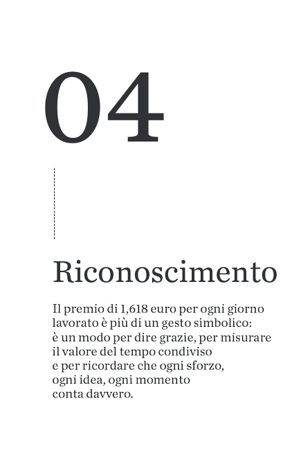 Il premio di 1,618 euro per ogni giorno lavorato è più di un gesto simbolico: è un modo per dire grazie, per misurare il valore del tempo condiviso e per ricordare che ogni sforzo, ogni idea, ogni momento conta davvero.
